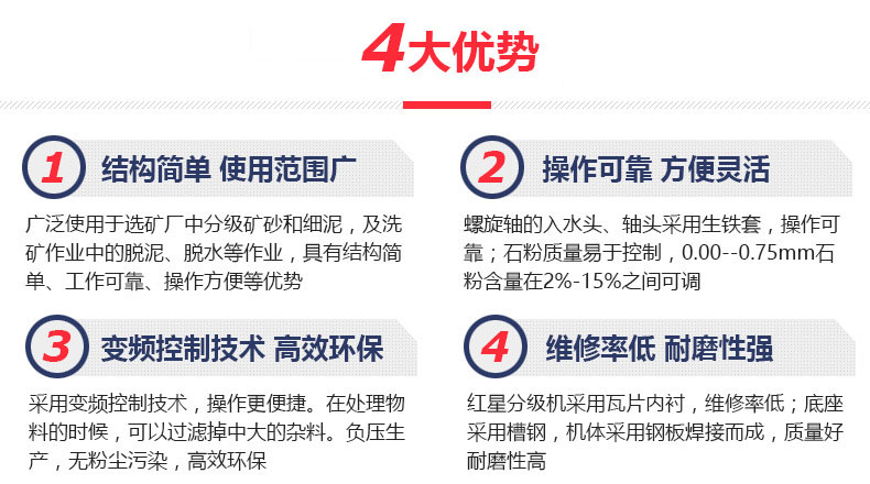 螺旋分级机是选矿的设备之一,螺旋分级机借助固体颗粒的比重不同,因而在液体中沉淀的速度不同的原理,进行机械分级的一种设备。螺旋分级机应用于处理冲积砂矿,尤其适合于有用矿物单体解离度高而且呈扁平状者。分级机主要有高堰式单螺旋和双螺旋、沉没式单螺旋和双螺旋四种分级机。