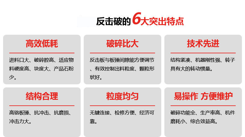 反击式破碎机是顺应市场需求出现一种新型破碎设备,不同于鄂破的挤压式破碎,反击式破碎机是利用冲击能对中等硬度脆性物料进行破碎的设备。PF反击式破碎机是结合自身优势并吸收国内外**技术开发的产品。具有破碎比大、产品粒度均匀且过粉现象少、能耗低、设备制造容易、维护方便、硬岩破碎高效节能、产品粒度调整范围大、排料粒度大小可调、简化破碎流程等优点。反击式破碎机能破碎进料粒度不超过500mm、抗压强度不超过350MPa的多种粗、中、细物料(花岗岩、石灰石、混凝土等),被广泛用于高速公路建设、水利工程和电力工程等领域,具有加工成品成立方体,无张力和裂缝,具有破碎比大、破碎效率高、维修方便等特点。