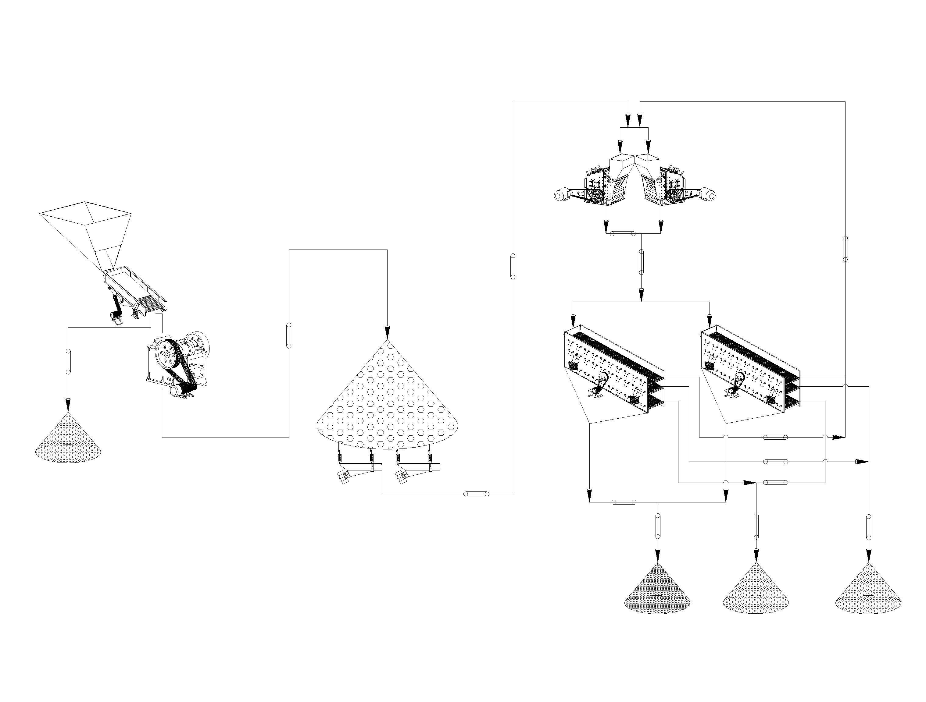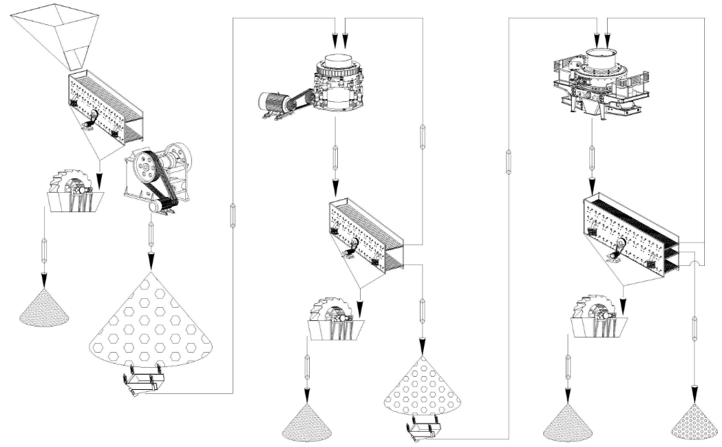 首先开采的鹅卵石通过振动筛进行筛分,将细小的符合要求的通过洗砂机直接制成成品料、不满足粒度要求的先通过颚式破碎机进行一级破碎,然后通过皮带机送入到圆锥破中进行二级破碎,破碎后的物料再次通过振动筛进行筛分,符合要求的通过洗砂机进行洗砂,不符合的物料通过皮带机送入到鹅卵石bsports必一体育中进行制砂、整形。再由振动筛进行筛分,降符合要求粒度大小的物料进行洗砂,不符合要求的物料再次通过鹅卵石bsports必一体育进行循环破碎,终得到成品物料。